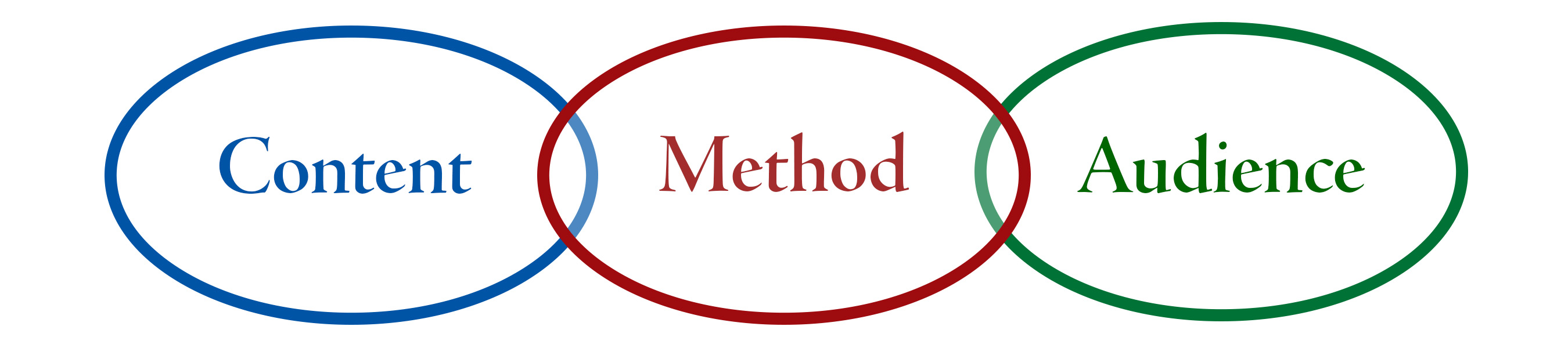 Methods are communication tools or strategies that link content and audience, providing the essential bridge between the site and its visitors, users, and supporters. Different audiences may prefer different experiences, for example a scavenger hunt for fourth graders, a smartphone application for young adults, and a curator-led tour for collectors. The same content can be presented differently, such as a guided tour of period rooms, a virtual tour online, or an illustrated book of scholarly essays.