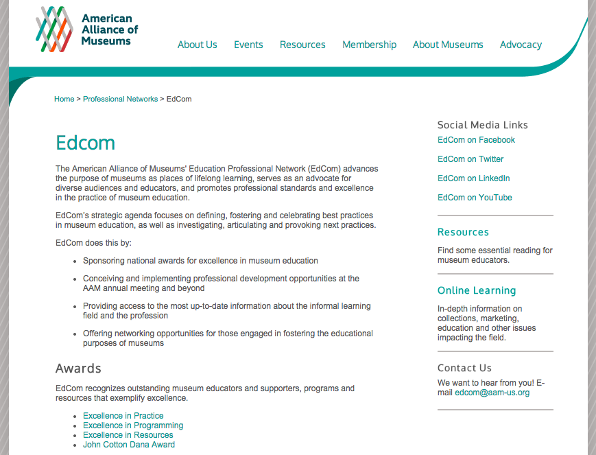 EdCom, the Education Professional Network of the American Alliance of Museums, recently revived its web page after a few months on hiatus. You’ll not only find basic information about EdCom, the group that’s focused on education and interpretation in all types of museums (including historic sites), but resources, such as “Excellence in Practice: Museum Education Principles and Standards,” and a suggested bibliography. If you want to keep on news, you’ll want to join them on Facebook, Twitter, or LinkedIn.