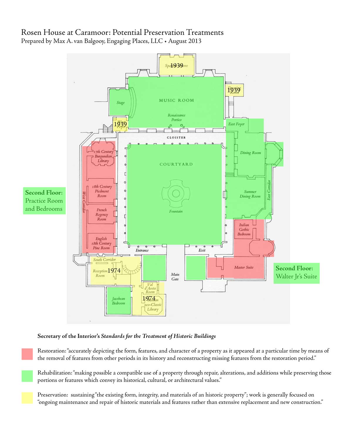 Increasingly I’m finding that the zoning of historic sites is a very useful way to evaluate an historic site and to guide decisions about use, preservation, and interpretation. I first encountered a type of zoning in 2003 at Drayton Hall when Michael Van Valkenburgh developed a landscape master plan that categorized architecture,vegetation, and circulation by time period for a 16-acre portion of the site. It prompted me to consider how the Secretary of the Interior’s Treatment of Historic Properties with its four approaches (preservation, rehabilitation, restoration, and reconstruction) could be selectively applied to historic house museums, who are often caught in dilemmas between preservation and use. My first opportunity to apply this idea was at Caramoor in New York last year. They were seeking ways to care for and interpret the historic Rosen House, which is actively used for concerts, tours, and events. After reviewing current uses, historical significance, and architectural integrity, and in consultation with staff, I created a zoning system to guide the preservation and activities in various spaces. They’ve been very pleased with the result and manner in which preservation and use are balanced.