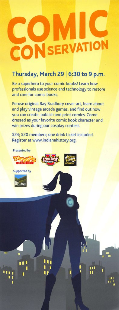 The Indiana Historical Society has cleverly combined its mission to connect “people to the past by collecting, preserving and sharing the state’s history” with the interests of the Comic Con audience by creating “Comic CONservation.” Participants will “learn how professionals use science and technology to restore and care for comic books” plus they get to play vintage arcade games and see original Ray Bradbury cover art from the nearby Center for Ray Bradbury Studies at IUPUI. Wow! IHS collections consists primarily of documents and photographs, plus they have a team of conservators working in a state-of-the-art paper conservation lab (The forceps are strong with this one), so they are drawing on their strengths to reach a new audience. Can’t wait to hear how this turns out (especially if people can dress as their favorite comic book character!).