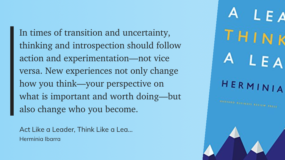 We’ve also introduced a book to read for the Seminar—that’s a big commitment! After exploring lots of possibilities, I chose Act Like a Leader, Think Like a Leader (2015) by Hermina Ibarra because it focuses on the challenges and opportunities facing mid-career professionals. The big idea is that the typical process of learning—theory, then practice—is actually more effective when reversed. By acting like a leader, you increase your knowledge and understanding, which then affects your thinking. Ibarra argues that, “the paradox of change is that the only way to alter the way we think is by doing the very things our habitual thinking keeps us from doing.” So far, we’ve read two chapters and already had discussions on the importance of shared vision, if our roles at work act more like hubs or bridges, the importance of slack time, the value of expanding your network, and the danger of the competency trap.