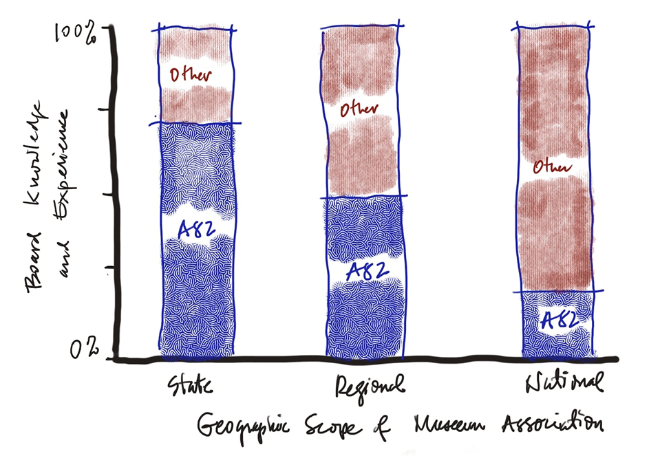 The other question asks how well these smaller, local organizations are represented in museum associations. The field’s sensitivity to equity and inclusion has grown, but it may be myopic. Our terribly unscientific sampling of board representation at the American Alliance of Museums, National Trust for Historic Preservation, New England Museum Association, Association of Midwest Museums, and Western Museums Association suggests that representation by A82 organizations may decline as geographic scope increases (see Figure 3). If that is accurate, how well are the needs, interests, assets, and ideas considered as these museum associations make decisions about ethics, practices, standards, priorities, and policies for the field? If they are largely absent, they have little influence.