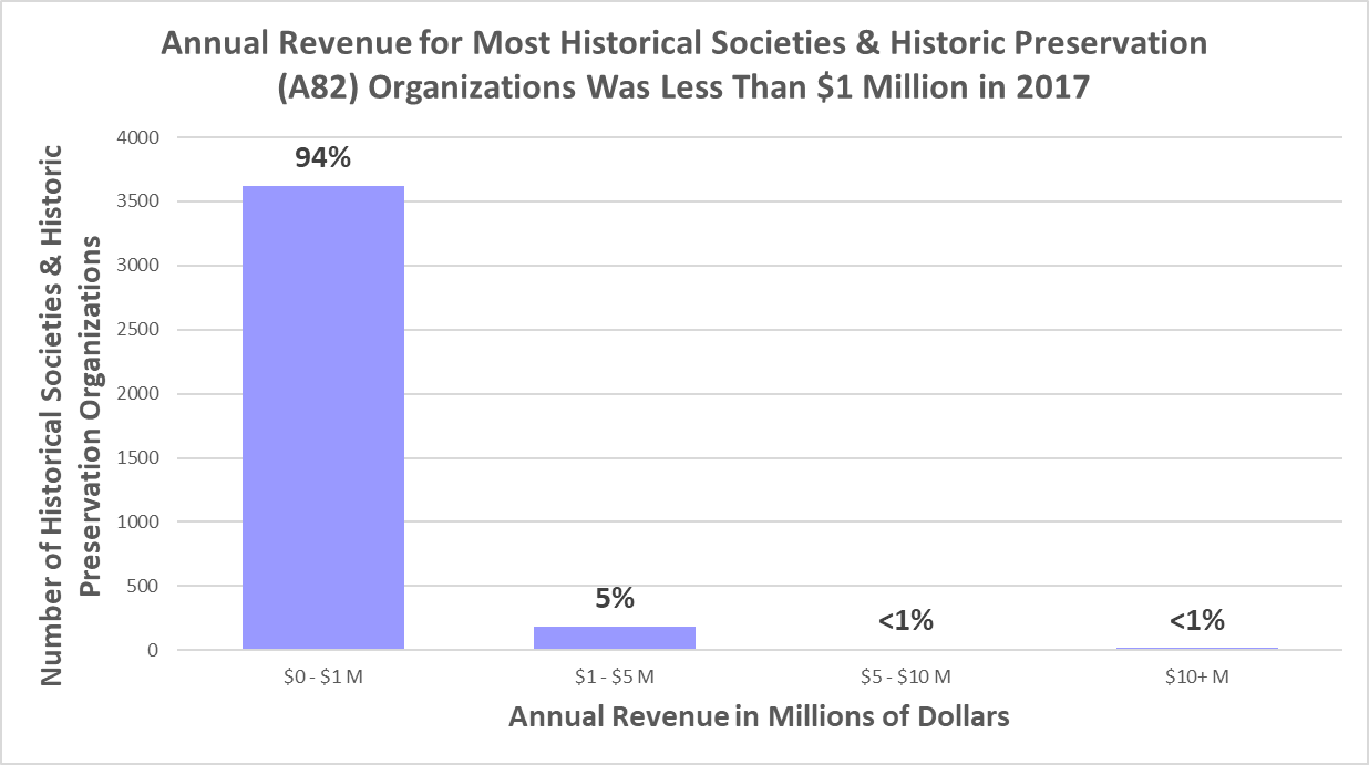 Going deeper, nearly 60 percent of these Historical Societies & Historic Preservation (A82) organizations operate with less than $100,000 in revenue annually. A sampling revealed that 15 percent did not have dedicated websites, many opting for Facebook as their main platform.