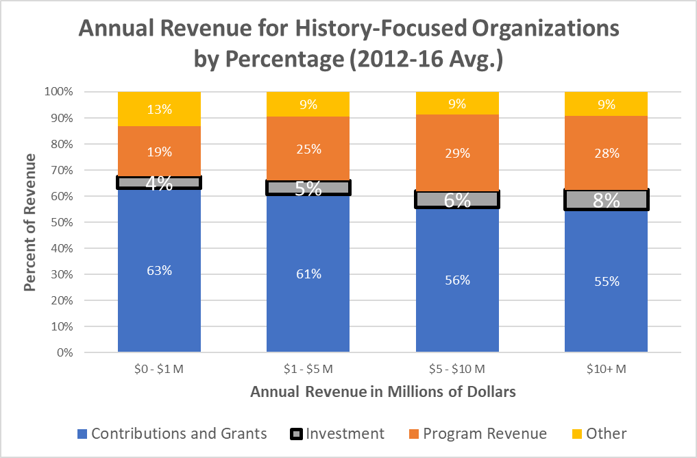 As total revenue increases, investment income increases to an even greater degree. Organizations with more than $10 million in annual revenue receive an average of 8% of this revenue from investment income (see Figure 2). Large mature institutions that have had time to build disproportionately large endowments can pursue a more aggressive approach. For example, Yale University uses their existing large endowment to pursue lucrative alternative investment opportunities such as private equity that are beyond the reach of small non-profits. This allows their endowment’s returns to outpace smaller non-profits, allowing them to lean even more heavily on this revenue stream. Those financial opportunities, unfortunately, are not possible for most History-Focused Organizations with annual revenues of less than $1 million. So what can they do?