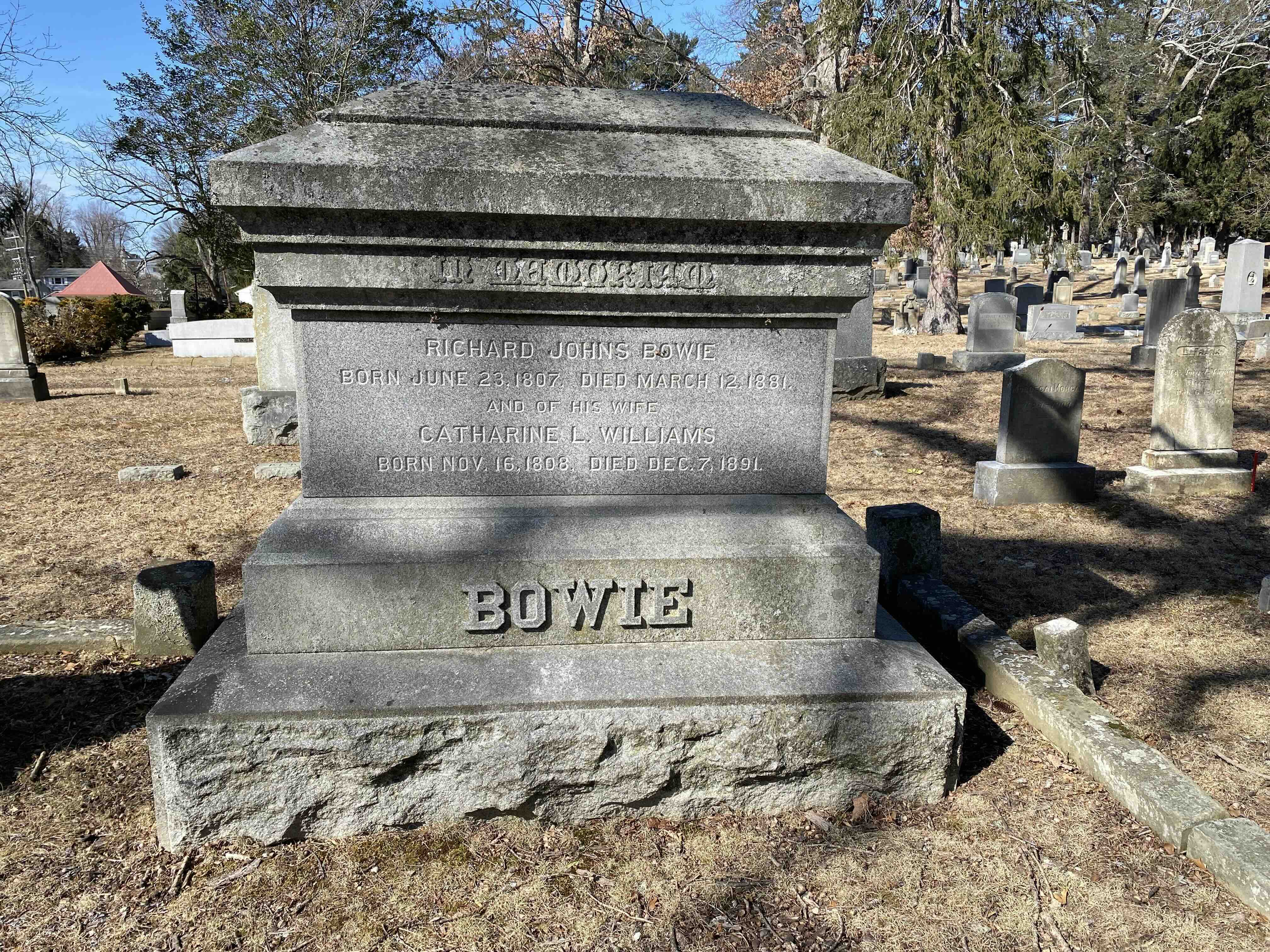 In her obituary, she is listed as “Mrs. Catharine L. Bowie, widow of the Hon. Richard Johns Bowie,” balancing her personal identity with her marital connection. Her headstone, however, lists her as “his wife Catherine L. Williams,” restoring her maiden name within the context of marriage. A smaller headstone marked “C.L.W.B.” preserves all aspects of her identity—first, middle, maiden, and married names.