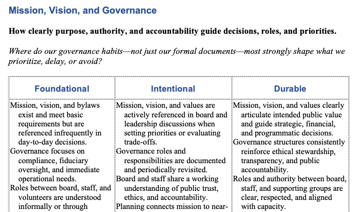 A matrix is not an evaluation tool. It’s closer to a diagnostic instrument—something you can use on your own, with your leadership team, or with your board to support higher-level conversations: