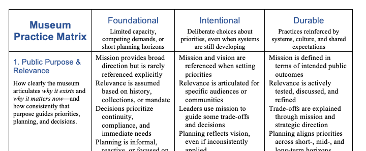 You may see that your museum is quite intentional about interpretation but still operating in a more foundational way when it comes to management systems. Or that community relationships are strong, but learning and evaluation are underdeveloped. Or that stewardship practices are solid, but public purpose and relevance are not consistently guiding decisions.