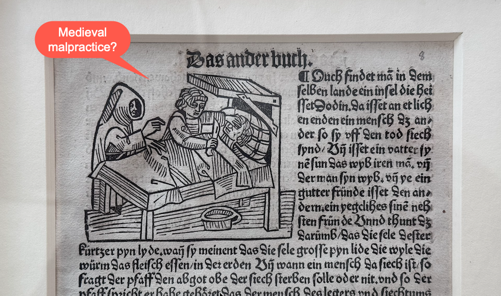 The typeface was Gothic, clearly German, probably around 1500. But the illustrations were strange. Instead of familiar late-medieval imagery (saints, cities, plants, kings) one woodcut showed a man lying in bed while another pressed a knife to his neck. Another showed a dining table with people seated around a severed head on a platter. Huh?