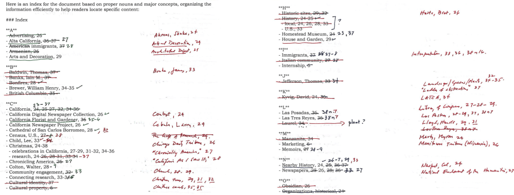 My chapter, “I’m Dreaming of a Warm Christmas: Researching California (and Other Local Places)” was initially indexed by GPT-3.5, then corrected manually as seen in this example. GPT-4o is more accurate when trained for indexing, but every entry still needs to be confirmed.