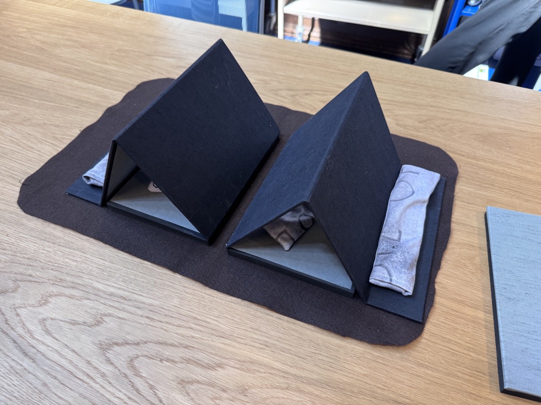 At first glance, it looks like a typical cradle, but it’s fully adjustable. Two triangular supports, covered in blue buckram cloth, can be moved farther apart or adjusted to change the angle, accommodating the size and shape of the book. Weights help stabilize the book on the cradle, while a brown felt mat underneath provides friction to prevent the supports from sliding.
