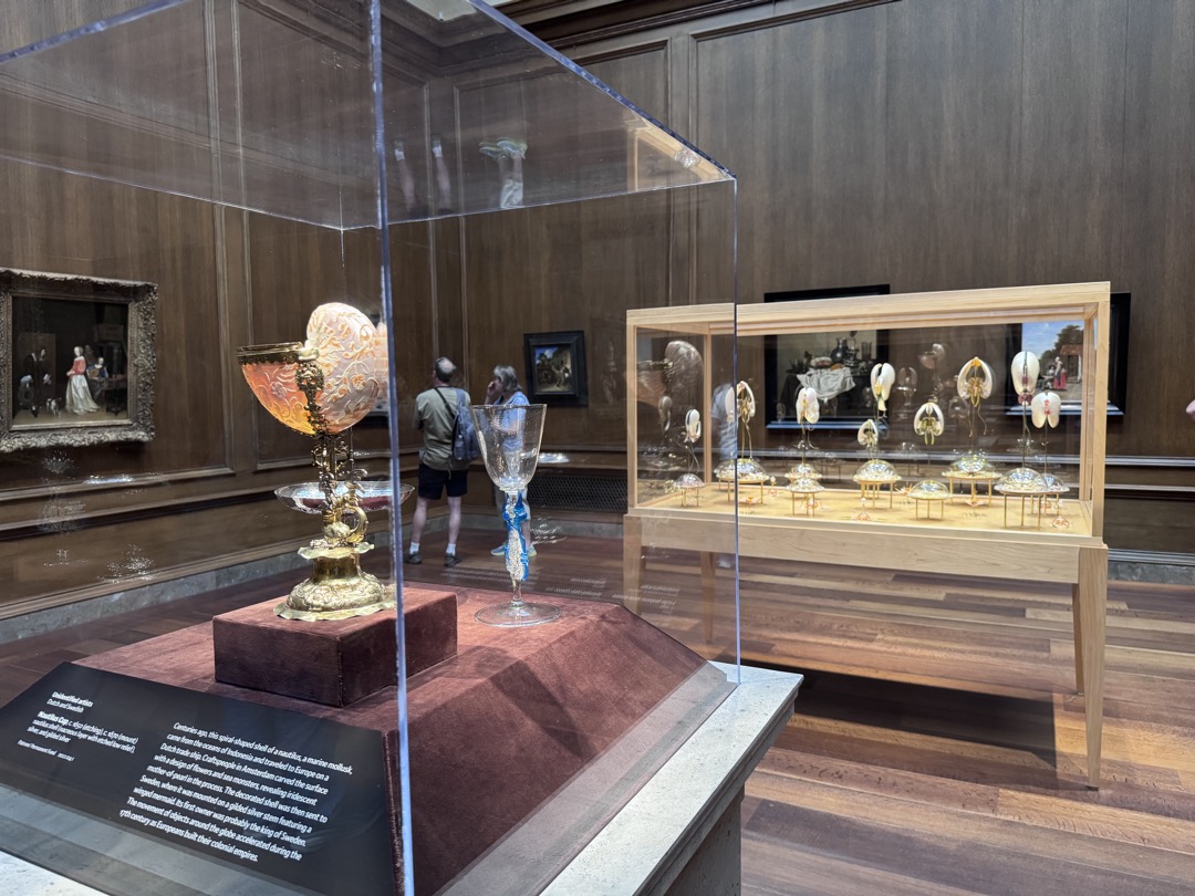 In the 17th-century Dutch landscape paintings gallery, two display cases offer a fresh angle on how nature shapes artistic imagination. One features three European decorative objects—a silver footed bowl, an elaborate stemmed glass, and a nautilus shell mounted on a gilt stand—designed to echo the forms and themes found in nearby paintings. The other case introduces a striking contemporary counterpart: Small Crafts on Sisyphean Seas by Dario Robleto, a mixed-media work combining natural materials like seashells, coral, urchin spines, and nautilus shells. These subtle interventions ask visitors to consider how objects, both functional and fantastic, reflect the human impulse to capture the natural world.