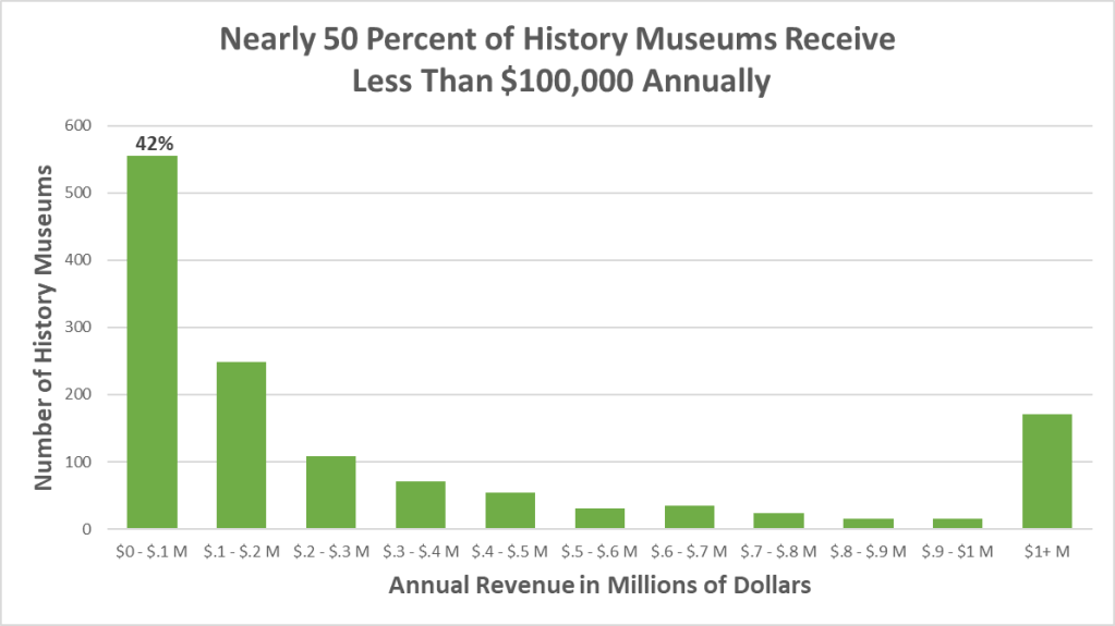 If a well-managed museum has robust programming, a large endowment, and a profitable gift shop, should they still rely on contributions and grants? Often regarded as a fundraising burden to reduce or eliminate, instead we might want to consider these revenue sources as one of the best ways to sustain and expand an institution. Sixty-six percent of History-Focused Organizations [Museums (NTEE A50), History Museums (A54), History Organizations (A80), and Historical Societies & Historic Preservation (A82)] depend on contributions and grants for at least half of their annual revenue and nearly forty percent rely on contributions and grants for more than three-quarters of their revenue (see Figure 1 below).