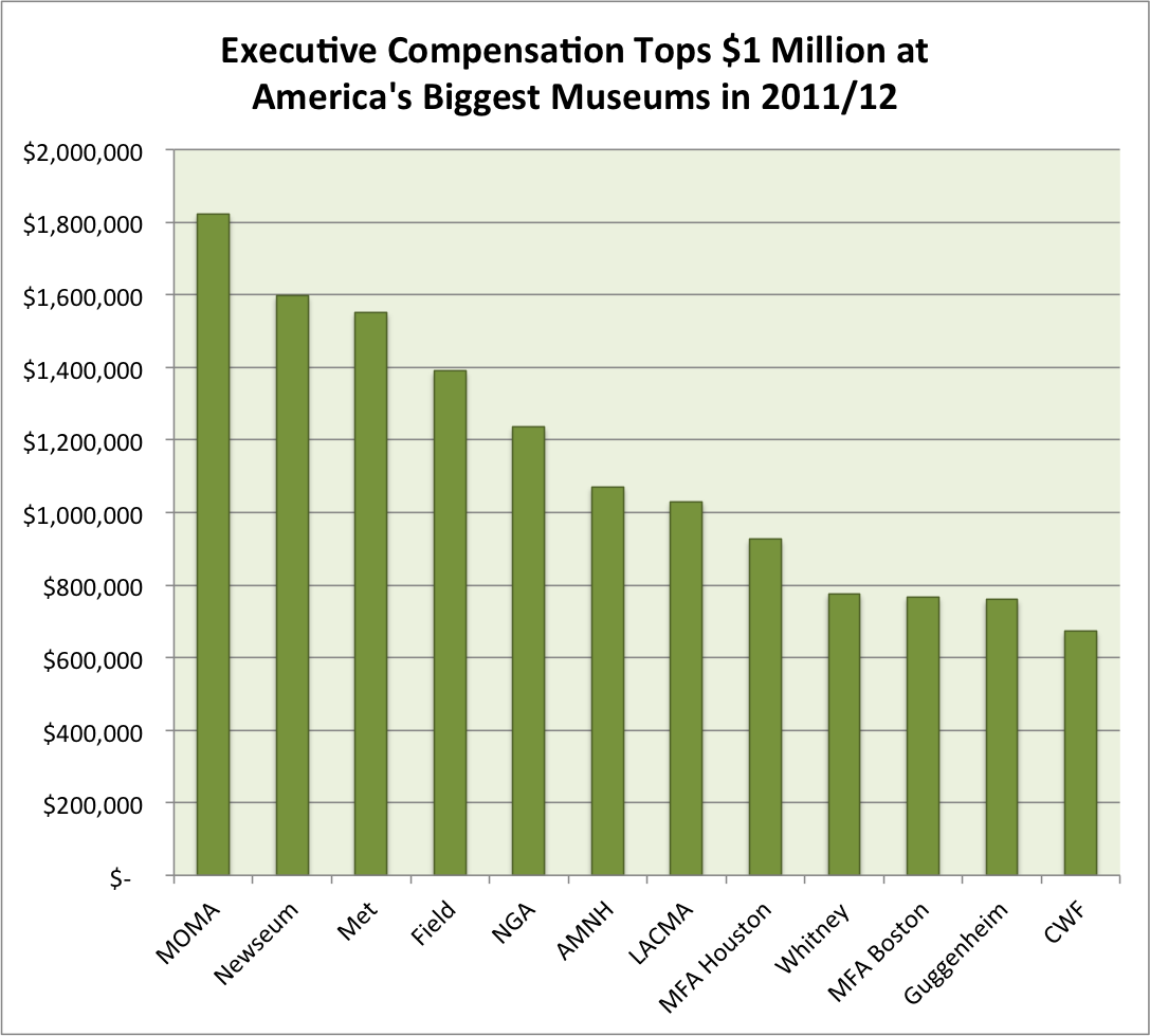 A review of the latest Forms 990 of more than two dozen of America’s biggest museums identified the most highly compensated executives in the field. Among these museums, annual compensation ranged from $228,000 to $1,822,257 and the average was $727,000. Seven directors earn more than one million dollars per year, as follows: